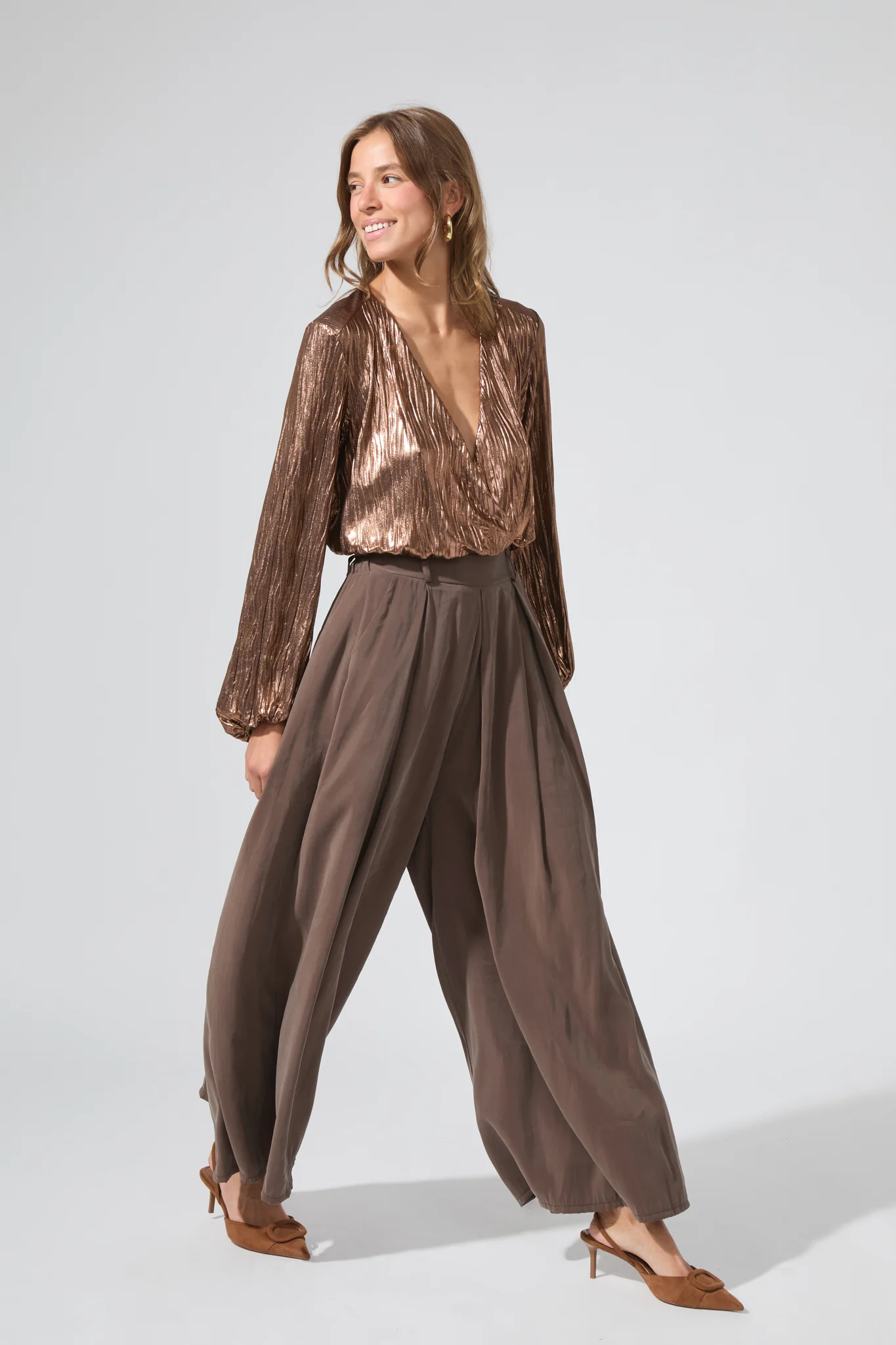 Le top Barbara est le must-have pour ajouter une touche éblouissante à votre garde-robe. Avec sa coupe courte, ressérée à la taille, il met en valeur la silhouette. Le tissu ajoute une dose de glamour à l'ensemble, tandis que les manches longues ajoutent une touche structurée et élégante.