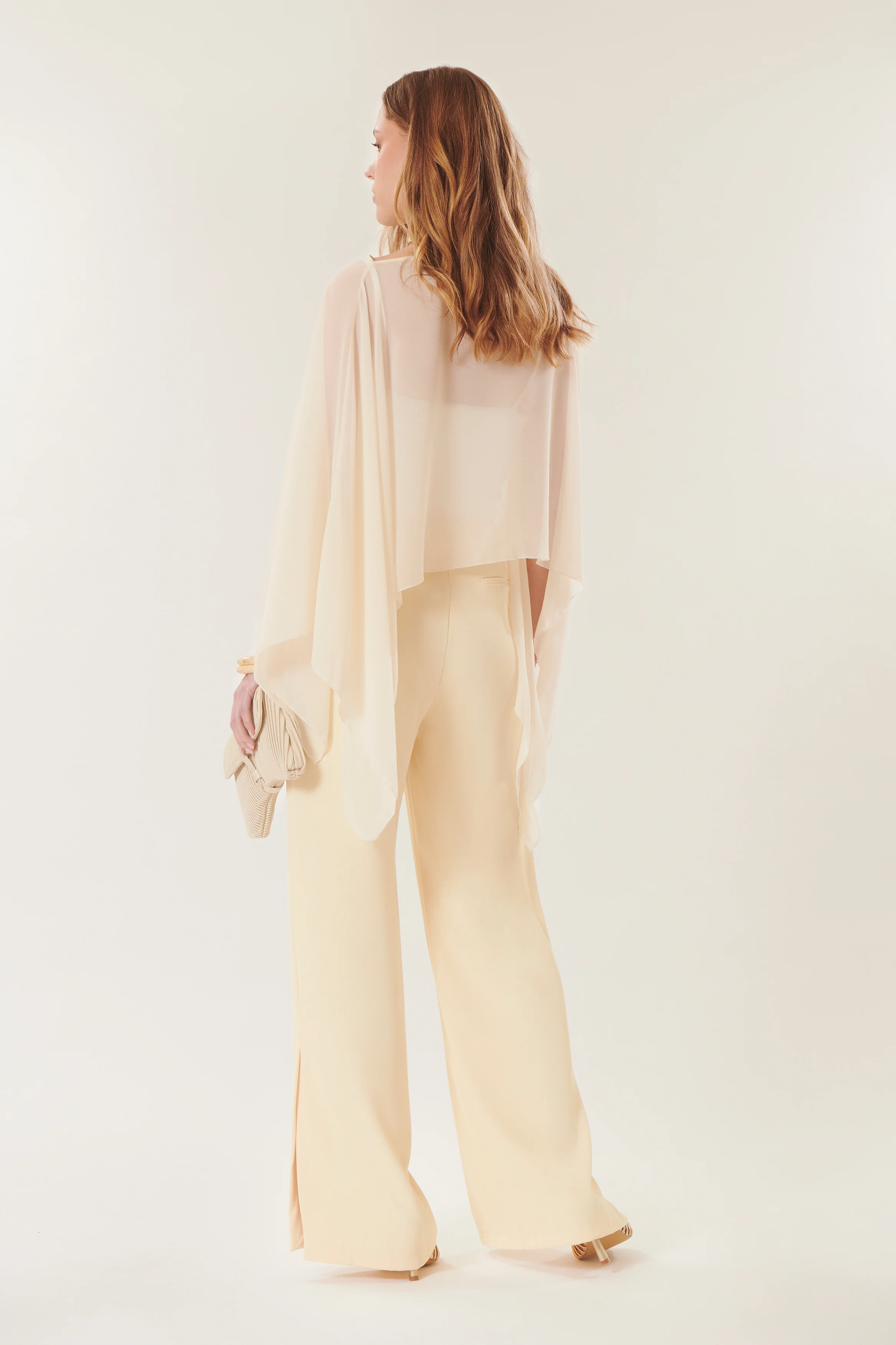 Légère et aérienne, cette cape fluide transparente en voile apporte une touche sophistiquée et moderne à votre silhouette. Son tombé vaporeux et sa transparence créent un jeu de mouvement élégant, parfait pour sublimer une tenue habillée ou structurer un look minimaliste avec féminité.