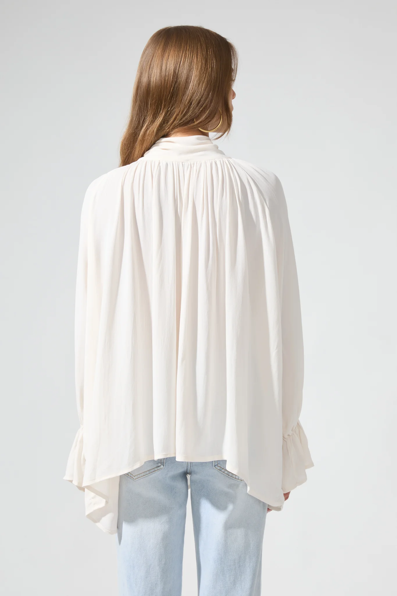 La chemise Nieva se distingue par son col lavallière à nouer, apportant une touche féminine et élégante. Ses manches longues se terminent par des poignets élastiqués légèrement froncés, créant un effet bouffant. Sa coupe ample assure confort et liberté de mouvement. Une pièce intemporelle et facile à assortir.