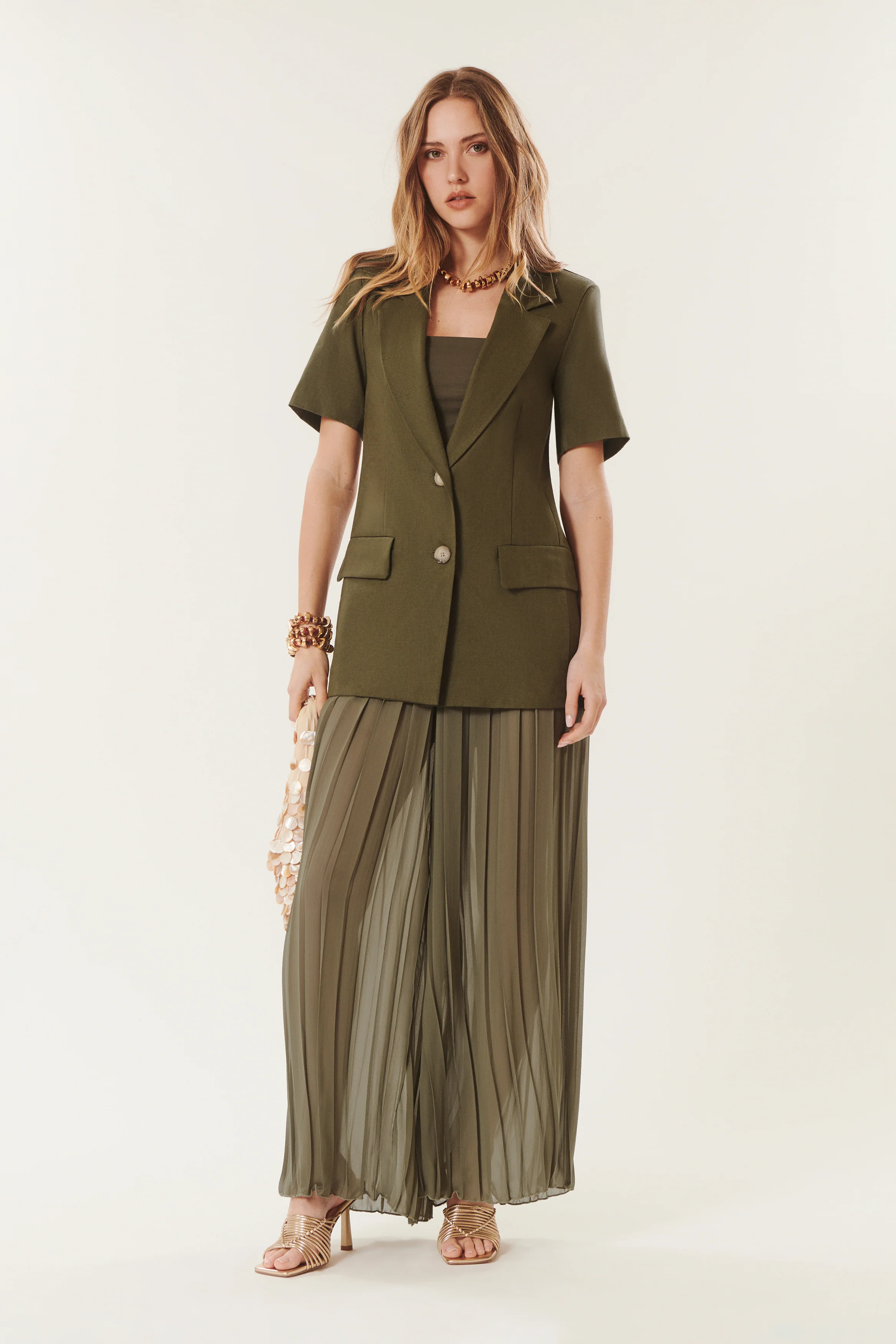 À associer avec un blazer structuré ton sur ton pour un ensemble sophistiqué, ou avec un top satiné et des sandales à talons pour une silhouette plus habillée. En version plus décontractée, portez-le avec des sandales plates minimalistes et un sac naturel.